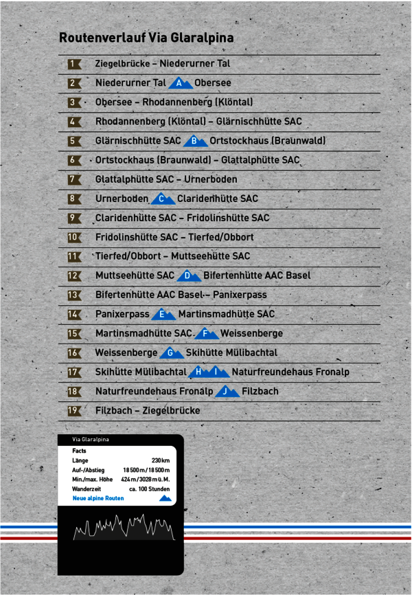 Im Frühling 2020 erblickt das neuste Kind der Via Glaralpina das Licht der Welt. Ein Wanderführer in Buchform. Die einzelnen Etappen werden anschaulich präsentiert, der Wanderer erfährt viel Wissenswertes über Botanik, Kultur und Geologie der einzelnen Etappen. Das Büchlein animiert, bereits zu Hause Via-Glaralpina-Luft zu schnuppern und sich mit den einzelnen Abschnitten vertraut zu machen. So kann man sich beim Wandern leichter auf die landschaftlichen, geologischen, botanischen und kulturellen Besonderheiten konzentrieren und sie ausgiebig geniessen.