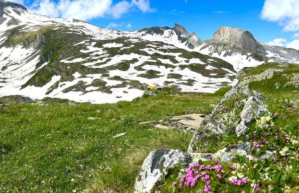 Kontrastprogramm: Die Blumenpracht auf dem Weg zur Glärnischhütte SAC / Etappenziel 04 / blüht bereits und gleichzeitig liegt noch Schnee im Abstieg der Zeinenfurgglen / Etappe 05. Diese Etappen wurden aber bereits gemacht.